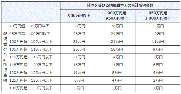 配偶者特別控除の控除額は次のとおりです。 なお、納税者の所得が1,000万円を超える場合は控除できません。